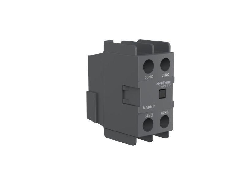 Блок дополнительных контактов для контакторов серии SystemePact MC1D; конфигурация 2НО; фронтальный монтаж с помощью винтовых зажимов. Блоки дополнительных контактов применяются совместно с контакторами и предназначены для увеличения количества вспомогательных контактов, использующихся в цепях сигнализации и управления (ранее Schneider Electric LADN20).