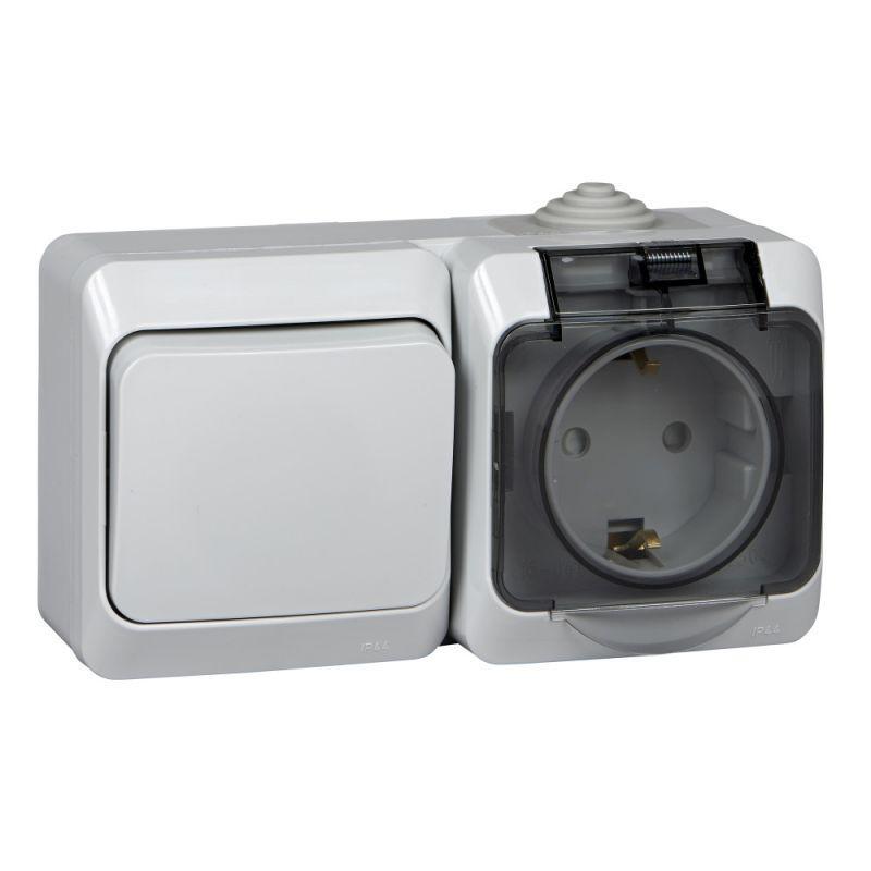 Блок Systeme Electric (ранее Schneider Electric) ЭТЮД (серый, открытой установки) предназначен для применения в сетях до 250В, состоит из розетки на 16А со шторками, без заземления и одноклавишного выключателя на 10А. Удобен в применении и отлично подходит для ванной комнаты (IP44). Сделано в России.