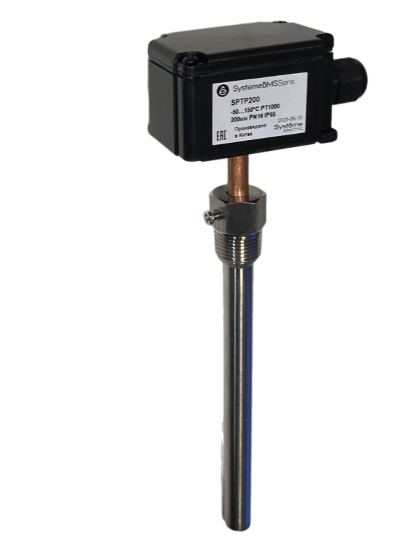 Датчик температуры погружной, диапазон измерения температуры -50…+150°С, выходной сигнал Pt1000, длина погружной части 200 мм, в комплект поставки входит гильза 150 мм, степень защиты корпуса IP65, условия эксплуатации -40…+80°С