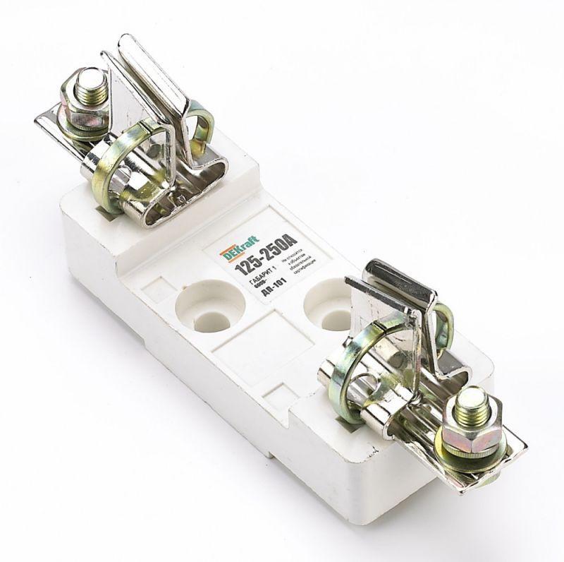 Держатель ножевого предохранителя серии ПН-101 Dekraft; тип 35; габарит 00; номинальный ток до 250 А. Предохранители ножевые применяются в однофазных и трехфазных сетях переменного тока, напряжением до 660 В, частотой 50 Гц. Держатель устойчив к механическим и термическим воздействиям, а также динамическим ударам при коротких замыканиях.