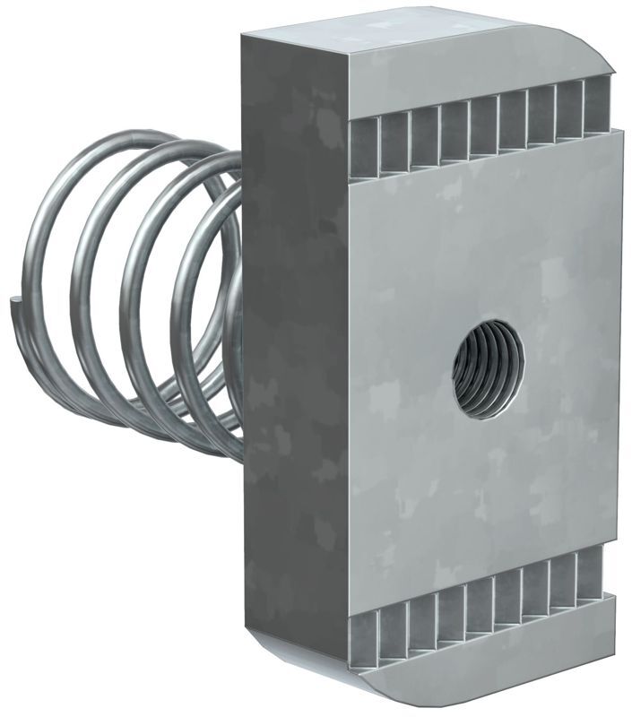 Гайка канальная с пружиной предназначена для крепления элементов STRUT-системы между собой, а также кабельных лотков к STRUT-консолям. Используется с профилем сечения 41х21.