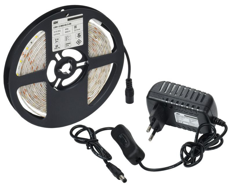 Комплект светодиодной подсветки "Сделай сам" DIY (лента LED 5м LSR-2835W60-4.8-IP65-12В + драйвер + выключатель) IEK 2LSR1-2-060-65-1-05-S1