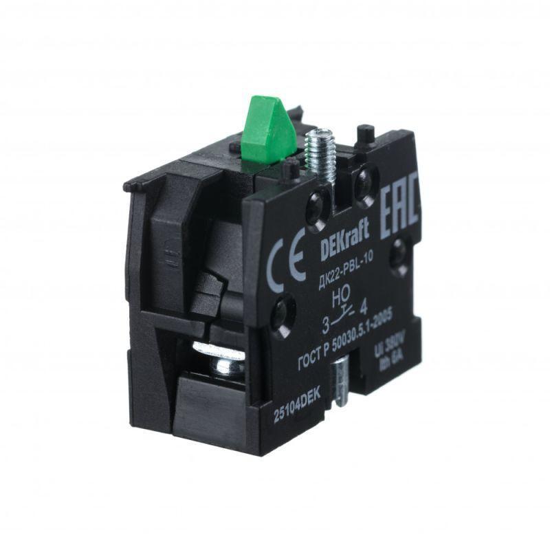 Контакт дополнительный серии ДК-22 Dekraft; предназначен для двойных кнопочных выключателей серий ПЕ-22; исполнение – 1НЗ; цвет – зеленый. Контакт устанавливается на управляющий элемент с правой или с левой стороны.