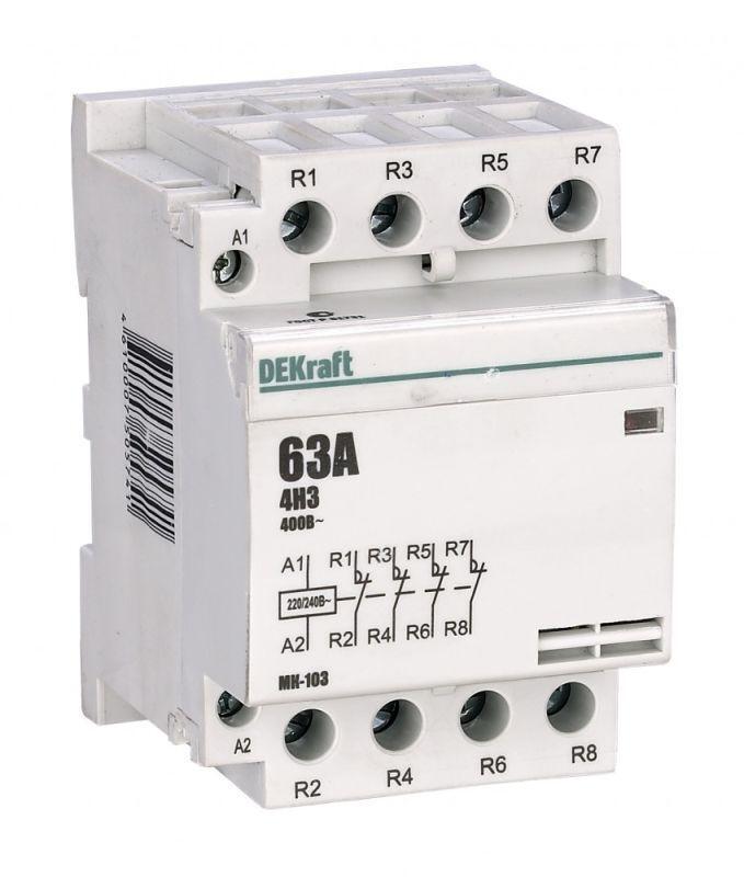 Модульный контактор серии МК-103 Dekraft; ном.ток 40 А (АС-7а); кол-во и исполнение контактов – 4НЗ; напряжение управления 220 В пер.тока; ширина – 3 мод. х 18 мм; установка – на DIN-рейку. Контакторы МК-103 применяются в сетях напряжением до 400 В пер.тока для дистанционного управления небольшими нагрузками, требующими большого количества включений / отключений, например, насосы, системы вентиляции и т.п. Модульные контакторы не требуют дополнительных настроек и специального обслуживания.