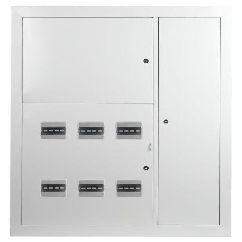 Щиты этажные металлические ТМ ЭРА SIMPLE предназначены для сборки учетно-распределительных устройств в жилых и общественных зданиях, а также для защиты отходящих линий при перегрузках и коротких замыканиях. Сварной металлический корпус состоит из трех отсеков: вводно-учетного, распределительного, отсека слаботочного оборудования. В вводно-учетном и распределительном отсеках размещены перфорированные DIN рейки для крепления счетчиков (по количеству квартир) рейки для крепления модульного оборудования и монтажная панель для крепления отводов от силового кабеля. Отсек слаботочного оборудования снабжен перфорированными DIN рейками и монтажной панелью для удобной прокладки и монтажа систем теле- и радиосетей, телефонных линий, сетей охранной сигнализации, домофонов. Щиты изготовлены из стали 0,8 -1,2 мм, покрыты полиэфирной порошковой краской RAL 7035 . Размер ниши 876х864х125