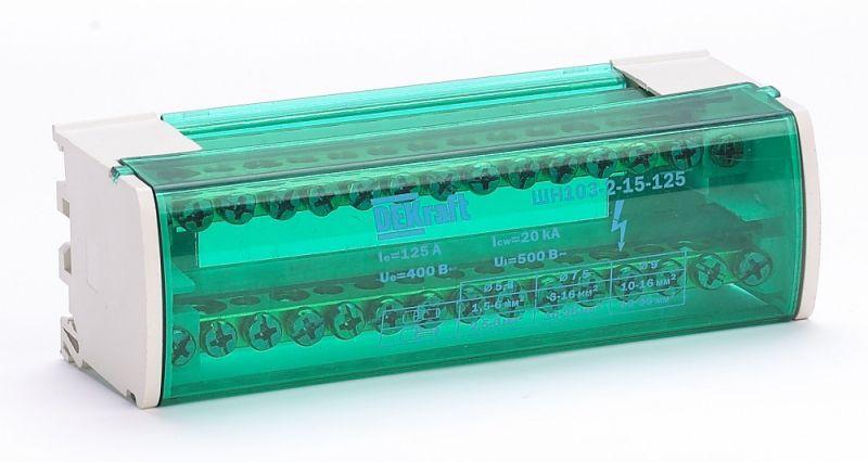 Кросс-модуль серии ШН-103 Dekraft; номинальный ток - 125 А; исполнение – 2 ряда по 15 отверстий (11х5,3 + 2x7,5 + 2x9,0); материал корпуса – нагревостойкий пластик; материал шин – высококачественная электротехническая бронза; каждая шина отдельно изолирована; цвет крышки – зеленый; установка – на DIN-рейку 35 мм или на монтажную панель двумя винтами M4; степень защиты - IP20. Применение кросс-модулей в щите обеспечивает компактную разводку кабелей и защиту от прикосновения к токоведущим частям.