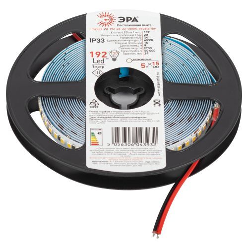 ЭРА Лента светодиодная LS2835-20-192-24-33-4000К-double-5m (25/50/300) со степенью защиты от пыли и влаги IP20 - современный способ создания внутреннего освещения, подсветки ниш, лестничного пространства, систем хранения, а также декоративного и художественного оформления любых объектов и форм в помещениях. Легко и быстро устанавливается на любой гладкой поверхности с помощью скотча, расположенного на оборотной стороне ленты Используя алюминиевый профиль, можно создавать необычные и функциональные решения освещения в Вашем интерьере. Рабочее напряжение ленты составляет 24В, а мощность равна 20Вт/м. Светодиодная лента обладает световым потоком 1300 Лм/м, и цветом свечения - дневной белый (4000 К) ВНИМАНИЕ: - светодиодную ленту с напряжением 24В допустимо подключать последовательно отрезками не более 10 м. - для светодиодных лент с мощностью выше 9.6 Вт обязательно использование алюминиевого профиля для дополнительного охлаждения. Это существенно продлит срок службы светодиодной ленты. - во избежание выхода из строя не допускается длительная работа ленты в смотанном виде