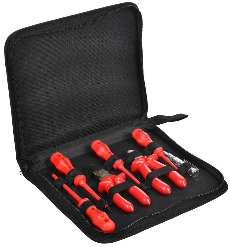 Набор диэлектрического инструмента N-02 серии К2 (Profi) рассчитан на использование под напряжением до 1000 В. Комплект включает в себя пассатижи 160мм, бокорезы 160мм, крестообразные отвертки PH1х80, PH2х100; шлицевые отвертки SL4,0х100, SL5,5х125 и отвертку-пробник ОП-1. Материал рукояток - поливинилхлорид PVC.