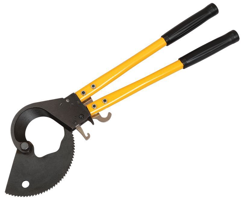 Инструмент для резки кабеля с пластмассовой и бумажной изоляцией изготавливается из инструментальной стали с высокой режущей способностью. Специальная геометрия лезвий позволят осуществлять работу безопасно и быстро. Обладает высокой стабильностью и незначительной массой. Ножницы секторные снабжены храповым механизмом, выдвижными ручками, блокиратором резки. Замок устроен таким образом, что позволяет осуществлять обратный ход лезвия, необходимый в случае попадания в нож посторонних объектов. Чрезвычайно высокая режущая способность инструмента достигается за счёт оптимальной конструкции ножниц и режущих ножей специальной геометрии.