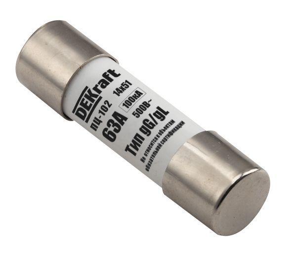 Предохранитель цилиндрический серии ПЦ-102 Dekraft; категория – gG; габарит - C14 (14 x 51 мм); номинальный ток 20 А; установка – в держателях на DIN- рейку; рабочее положение - любое, но предпочтительнее вертикальное. Цилиндрические предохранители применяются для защиты сигнальных, управляющих электрический цепей (класс gG) от перегрузки и токов КЗ в сетях напряжением до 500 В. Предохранители устанавливаются в шкафах управления и распределительных щитах низкого напряжения.