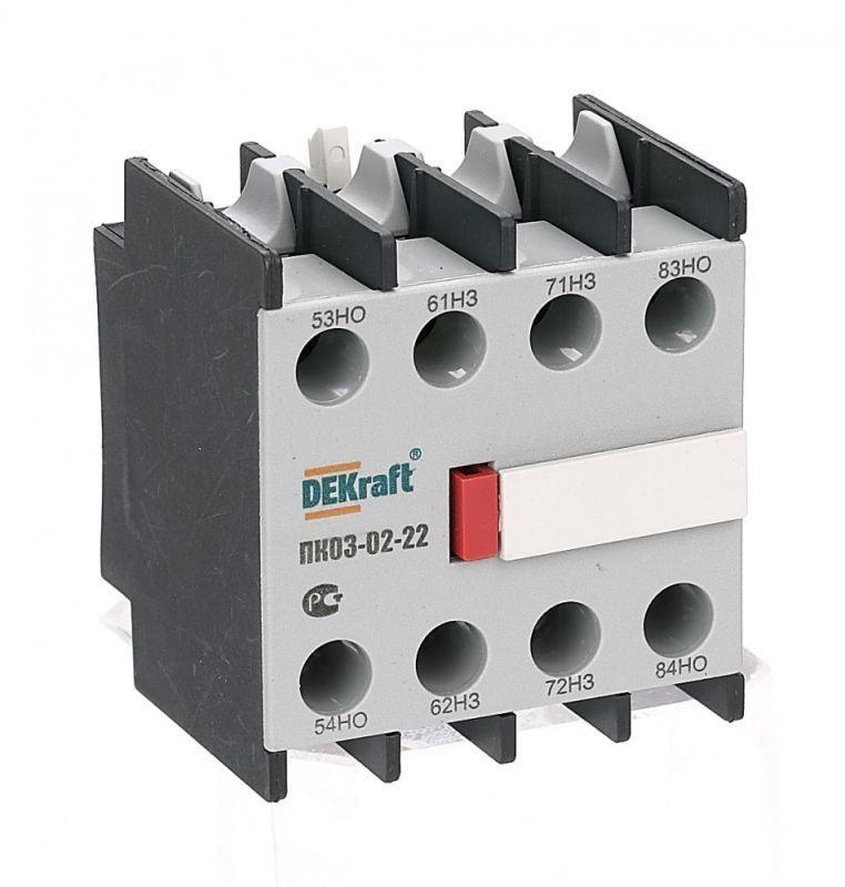 Приставка контактная серии ПК-03-02 для контакторов КМ-103 Dekraft; кол-во контактов - 2НО+2НЗ; ном.ток 10 А; ном.напряжение до 690 В; установка с лицевой стороны; степень защиты IP20. Приставки контактные предназначены для увеличения количества вспомогательных контактов контактора. Контактные приставки механически соединяются с контакторами и фиксируются при помощи защелки. Приставка подходит для использования с контакторами других производителей.