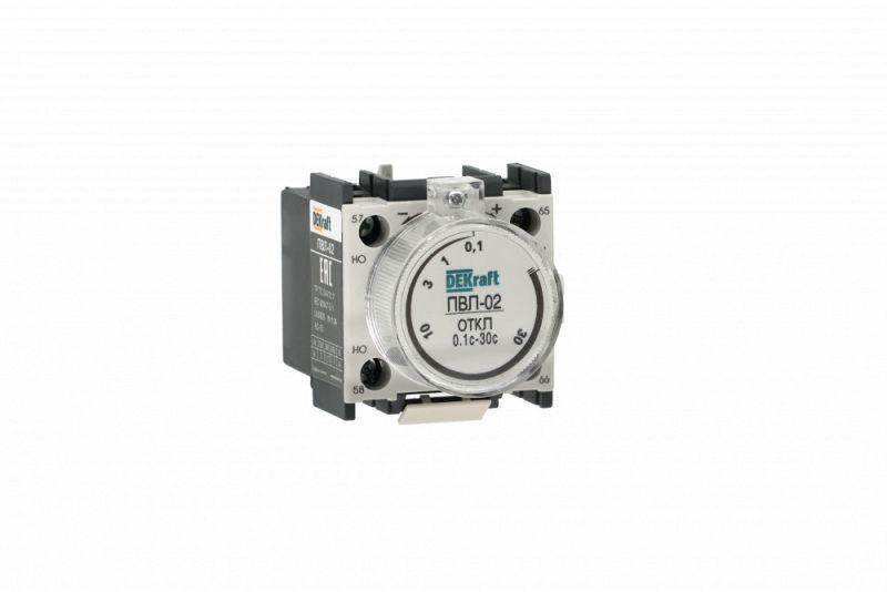 Приставка выдержки времени ПВЛ-02 для контакторов КМ-102 Dekraft; выдержка - 0,1…30 секунд; задержка - при отключении; ном.ток 10 А; ном.напряжение до 690 В; монтаж защелкой на контакторе; степень защиты IP20. Приставки выдержки времени позволяют получить задержку замыкания или размыкания контактов цепи управления, например, в схема включения двигателя «звезда/треугольник; или для обеспечения паузы между циклами технологического процесса.