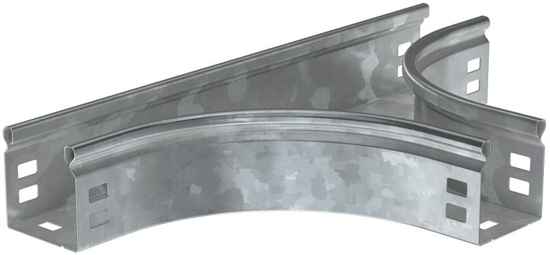 Разветвитель Т-образный плавный предназначен для организации Т-образного ответвления кабельной трассы. Крышка аксессуара в комплект не входит. Аксессуар изготовлен из стали с цинковым покрытием, нанесенным погружением изделий в расплав цинка (защитный слой цинка не менее 55 мкм).