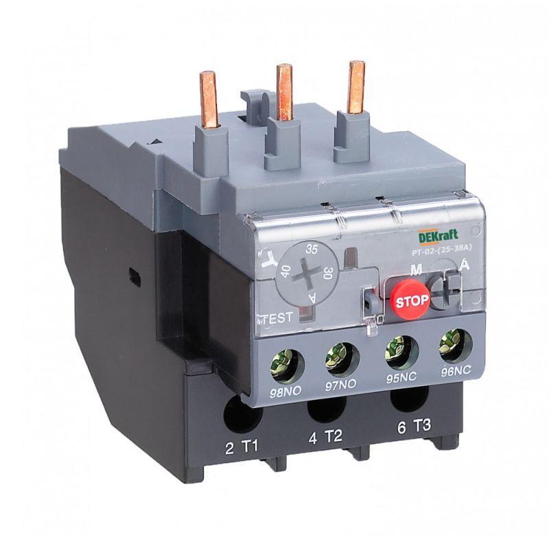 Тепловое реле перегрузки серии РТ-02 Dekraft; предназначено для применения с контакторами КМ-102 на ток 38 А; трехполюсное; диапазон уставок реле 30,0-40,0 А; класс расцепления 10А; два режима повторного включения - ручной и автоматический. Тепловые реле РТ-02 применяются для защиты цепей переменного тока и электродвигателей от перегрузки, асимметрии фаз, затянутого пуска и заклинивания ротора. Реле подходит к соответствующим контакторам других производителей.