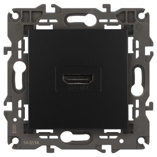 Розетка HDMI серии Эра Elegance цвет антрацит 14-3114-05. Рамки приобретаются отдельно. Рамки Эра Elegance ПЛАСТИК: 1 пост 14-5001-хх, 2 поста 14-5002-хх, 3 поста 14-5003-хх, 4 поста 14-5004-хх, 5 постов 14-5005-хх; СТЕКЛО: 1 пост 14-5101-хх, 2 поста 14-5102-хх, 3 поста 14-5103-хх, 4 поста 14-5104-хх; МЕТАЛЛ: 1 пост 14-5201-хх, 2 поста 14-5202-хх, 3 поста 14-5203-хх, 4 поста 14-5204-хх; ДЕРЕВО: 1 пост 14-5301-хх, 2 поста 14-5302-хх, 3 поста 14-5303-хх, 4 поста 14-5304-хх (хх - код цвета: 00-прозрачный, 01-белый, белёный дуб, 02-слоновая кость, 03-алюминий, 04-шампань, 05-чёрный, чёрное дерево, 07-ясень, 09-дуб, 10-венге, 11-клён, 14-медь, 21-жёлтый, 22-оранжевый, 23-красный, 25-бордо, 26-лайм, 27-зелёный, 28-голубой, 29-синий, 30-розовый, 31-мокко, 32-серый, 41-сталь, 42-титан).