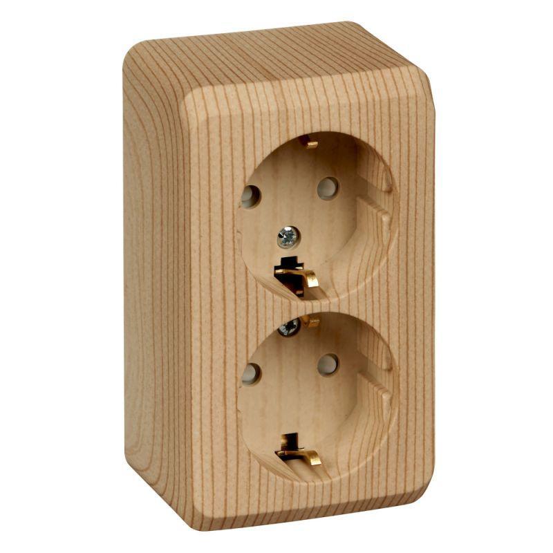 Розетка Systeme Electric (ранее Schneider Electric) ЭТЮД (сосна, открытой установки) двухместная с заземлением и шторками предназначена для применения в сетях до 250В, на ток до 16А. Двухместная розетка позволяет подключить два устройства в одном месте. Шторки и заземление обеспечивают дополнительную безопасность при косвенных прикосновениях. Изделия цвета Сосна обладают уникальным рисунком, напоминающим древесный сруб. Сделано в России.