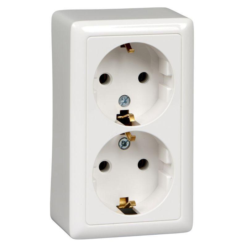 Розетка Systeme Electric (ранее Schneider Electric) ХИТ (открытой установки, цвет белый) двойная с заземлением, без шторок предназначена для сетей до 250 В на ток до 16 А. Двойная розетка позволяет подключить два устройства в одном месте. Заземляющий контакт обеспечивает дополнительную защиту от удара электрическим током. При наличии заземления электрический потенциал уходит в землю, защищая человека. Сделано в России.