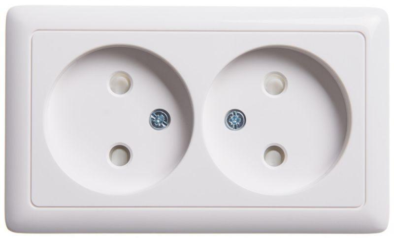 Розетка Systeme Electric (ранее Schneider Electric) ХИТ (открытой установки, цвет белый) двойная без заземления, со шторками предназначена для сетей до 250 В на ток до 16 А. Двойная розетка позволяет подключить два устройства в одном месте. Шторки обеспечивают дополнительную безопасность в доме, где находятся дети. Сделано в России.