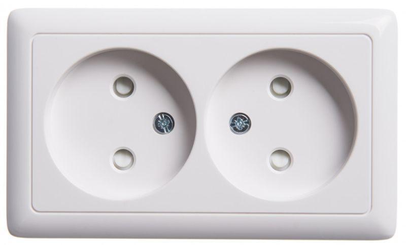 Розетка Systeme Electric (ранее Schneider Electric) ХИТ (открытой установки, цвет белый) двойная без заземления, со шторками, с изолирующей пластиковой пластиной предназначена для сетей до 250 В на ток до 16 А. Двойная розетка позволяет подключить два устройства в одном месте. Шторки обеспечивают дополнительную безопасность в доме, где находятся дети. Сделано в России.