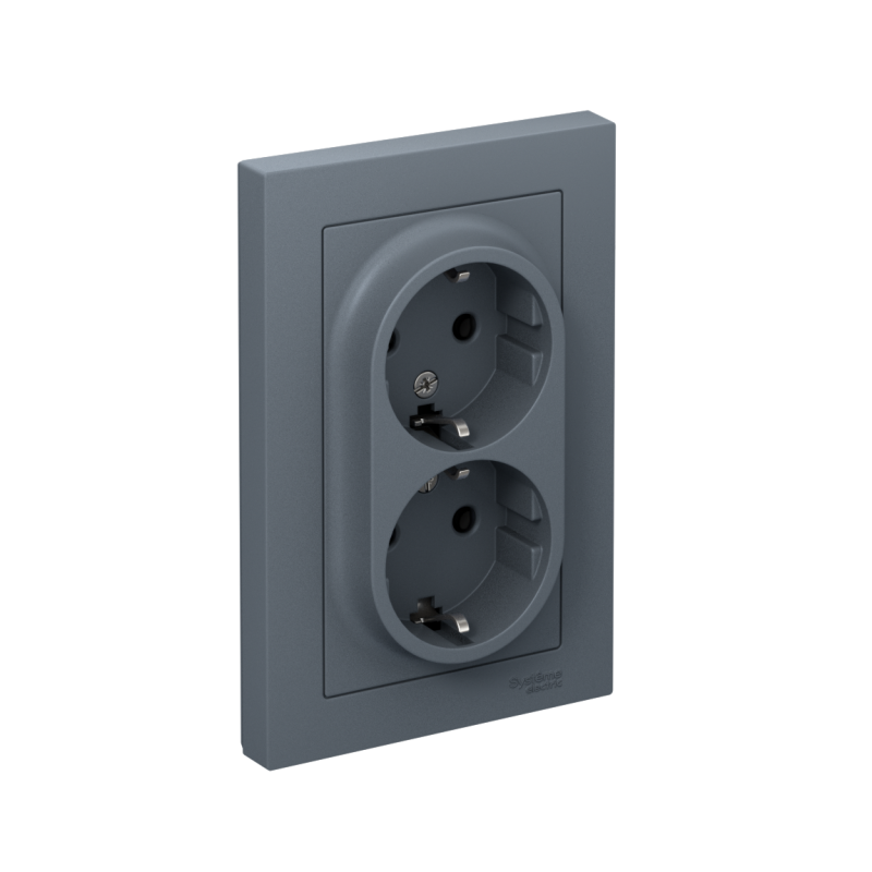 Розетка двойная в сборе Systeme Electric (ранее Schneider Electric) серии AtlasDesign в цвете грифель с заземлением, без шторок подходит для сетей 250 В, на ток 16 А. Заземляющий контакт обеспечивает дополнительную защиту от удара электрическим током. Лицевые детали из качественного ABS-пластика, устойчивого к царапинам и УФ-излучению. Двойная розетка позволяет подключить два устройства в одном месте. Изделие поставляется в комплекте с рамкой того же цвета.