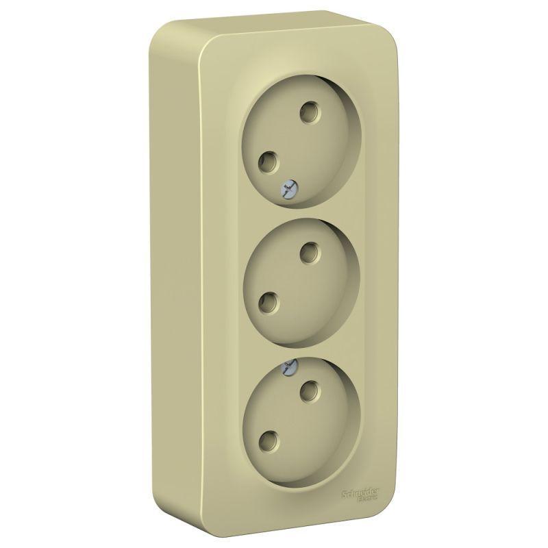 Розетка Systeme Electric (ранее Schneider Electric) BLANCA (открытой установки, цвет бежевый) трёхместная без заземления и шторок, с изолирующей пластиной подходит для сетей 250 В, на ток 16 А. Входные отверстия расположены под углом 45 градусов, благодаря чему можно подключить несколько устройств: вилки и адаптеры не будут мешать друг другу. Четкая маркировка клемм для безошибочного подключения. Корпус изделия выполнен из ABS-пластика