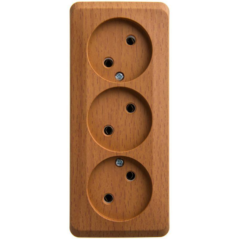 Розетка Systeme Electric (ранее Schneider Electric) ЭТЮД (бук, открытой установки) трёхместная, без шторок и заземления предназначена для применения в сетях до 250В, на ток до 16А. Трёхместная розетка позволяет подключить три устройства в одном месте. Она проста в установке и удобна в применении. Изделия цвета Бук обладают уникальным рисунком, напоминающим древесный сруб. Сделано в России.