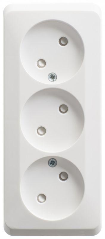 Розетка Systeme Electric (ранее Schneider Electric) ЭТЮД (белый, открытой установки) трёхместная со шторками, без заземления предназначена для применения в сетях до 250В, на ток до 16А. Трёхместная розетка позволяет подключить три устройства в одном месте. Шторки обеспечивают дополнительную безопасность в доме, где находятся дети. Сделано в России.