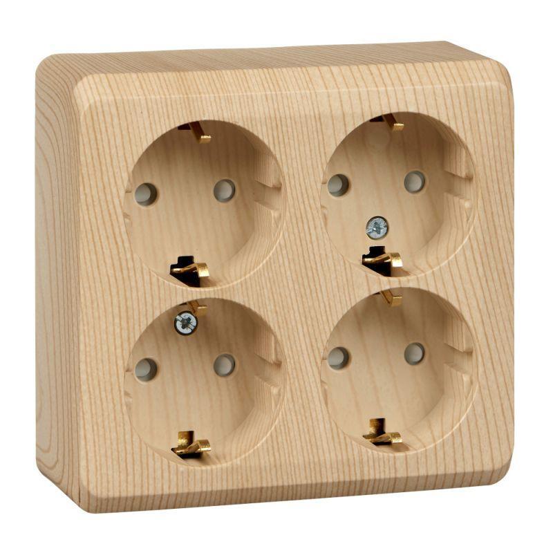 Розетка Systeme Electric (ранее Schneider Electric) ЭТЮД (сосна, открытой установки) четырёхместная с заземлением и шторками предназначена для применения в сетях до 250В, на ток до 16А. Четырёхместная розетка позволяет подключить четыре устройства в одном месте. Шторки и заземление обеспечивают дополнительную безопасность при косвенных прикосновениях. Изделия цвета Сосна обладают уникальным рисунком, напоминающим древесный сруб. Сделано в России.
