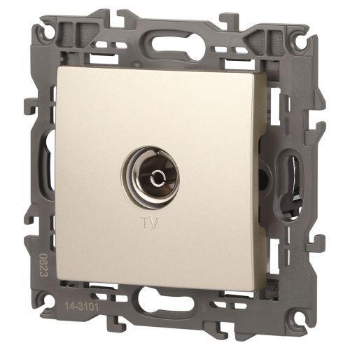 Розетка телевизионная одиночная серии Эра Elegance цвет шампань 14-3101-04. Рамки приобретаются отдельно. Рамки Эра Elegance ПЛАСТИК: 1 пост 14-5001-хх, 2 поста 14-5002-хх, 3 поста 14-5003-хх, 4 поста 14-5004-хх, 5 постов 14-5005-хх; СТЕКЛО: 1 пост 14-5101-хх, 2 поста 14-5102-хх, 3 поста 14-5103-хх, 4 поста 14-5104-хх; МЕТАЛЛ: 1 пост 14-5201-хх, 2 поста 14-5202-хх, 3 поста 14-5203-хх, 4 поста 14-5204-хх; ДЕРЕВО: 1 пост 14-5301-хх, 2 поста 14-5302-хх, 3 поста 14-5303-хх, 4 поста 14-5304-хх (хх - код цвета: 00-прозрачный, 01-белый, белёный дуб, 02-слоновая кость, 03-алюминий, 04-шампань, 05-чёрный, чёрное дерево, 07-ясень, 09-дуб, 10-венге, 11-клён, 14-медь, 21-жёлтый, 22-оранжевый, 23-красный, 25-бордо, 26-лайм, 27-зелёный, 28-голубой, 29-синий, 30-розовый, 31-мокко, 32-серый, 41-сталь, 42-титан).