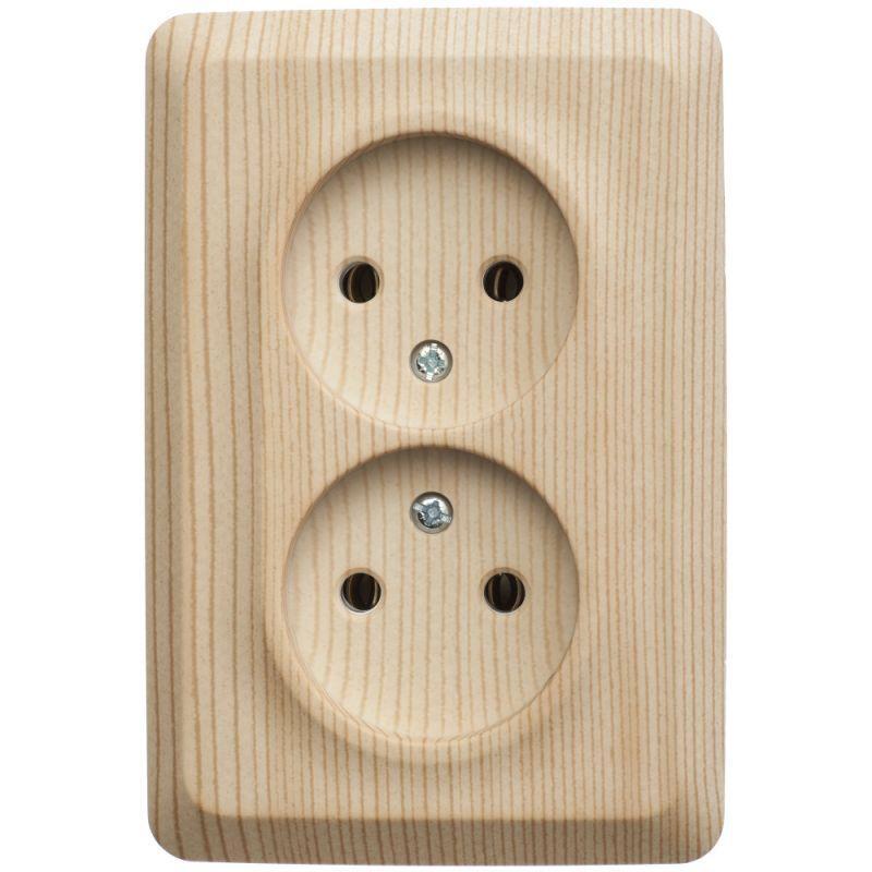 Розетка Systeme Electric (ранее Schneider Electric) ЭТЮД (сосна, открытой установки) двухместная угловая, без шторок и заземления предназначена для применения в сетях до 250В, на ток до 16А. Двухместная розетка позволяет подключить два устройства в одном месте. Ее конструкция позволяет установить розетку в угол помещения. Изделия цвета Сосна обладают уникальным рисунком, напоминающим древесный сруб. Сделано в России.