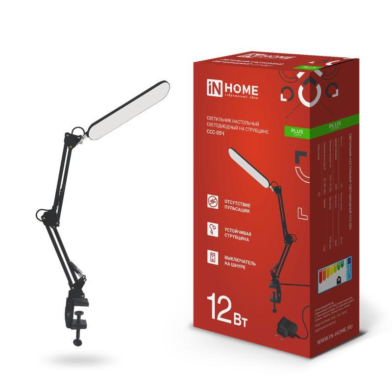 Светильник светодиодный настольный PLUS ССC-05Ч 12Вт 6500К 500лм USB с адаптером на струбцине черн. IN HOME 4690612045320