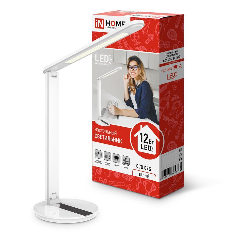 Светильник светодиодный настольный ССО 07Б 12Вт 3000-6500К 600лм сенсор-диммер с адаптером бел. IN HOME 4690612036533
