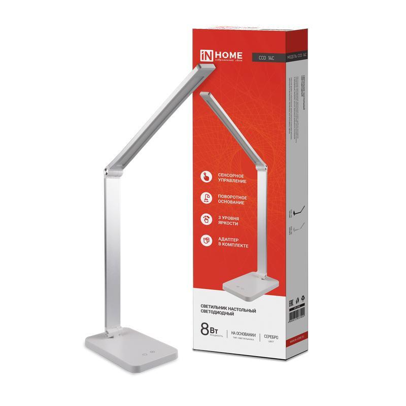 Светильник светодиодный настольный ССО 14С 8Вт 3000-6500К 480лм сенсор-диммер с адаптером серебр. IN HOME 4690612037905