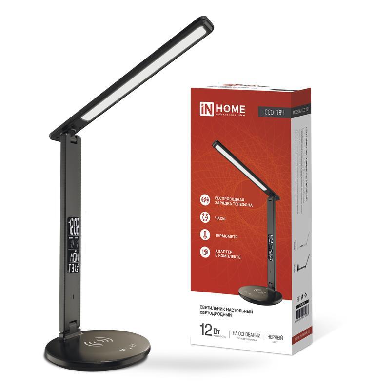 Светильник светодиодный настольный ССО 18Ч 12Вт 3-6.5К 600лм сенсор-диммер часы темп. беспроводн. зарядка с адаптером черн. IN HOME 4690612041087
