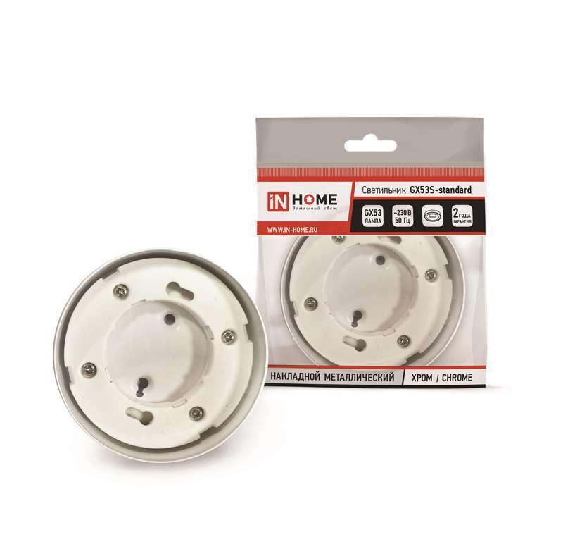 Накладной настенно-потолочный светильник ТМ In Home серии GX53S- standard может работать со светодиодными лампами GX53 мощностью от 4.2 Вт до 10 Вт. Линейка встраиваемых светильников GX53S-standard представлена в золотом, хромированном и белом вариантах корпуса. Модель проста в монтаже, подходит для установки в подвесные и натяжные потолки, подсветки мебели (например, кухонной зоны, шкафов-купе), витрин и т.п. Может применятся для общего и декоративного освещения интерьеров торговых, офисных, административных, жилых и других помещений. Материал корпуса светодиодного светильника – металл, который практически не нагревается в процессе эксплуатации. Не требует дополнительной теплоизоляции. Предназначен для работы в сетях переменного тока 230 В. Лампы в комплект не входят. Гарантия 2 года. Имеет сертификат ТР ТС (таможенного союза) EAC.