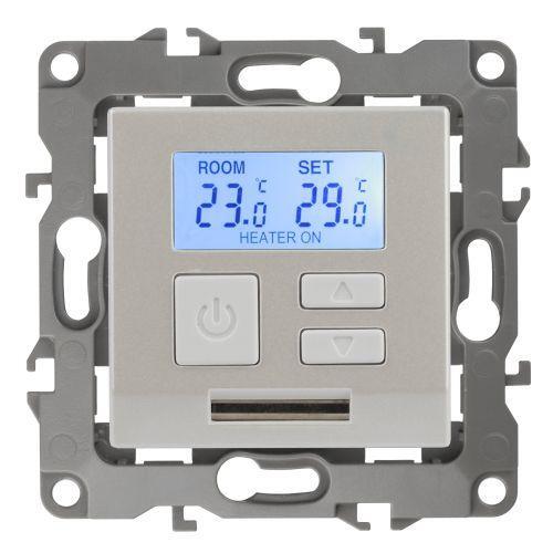 Терморегулятор теплый пол / отопление электронный серии Эра 12 СУ механизм цвет перламутр 12-4111-15. Номинальные характеристики 16А 230В. Сделана из поликарбоната. Монтаж в подрозетник производится и на лапки, и на винты. Рамки приобретаются отдельно. Рамки Эра 12: 1 пост 12-5001-хх, 2 поста 12-5002-хх, 3 поста 12-5003-хх, 4 поста 12-5004-хх, 5 постов 12-5005-хх. Рамки Эра 12 Сатин: 1 пост 12-5101-хх, 2 поста 12-5102-хх, 3 поста 12-5103-хх, 4 поста 12-5104-хх, 5 постов - 12-5105-хх (хх - код цвета: 01-белый, 02-слоновая кость, 03-алюминий, 04-шампань, 05-антрацит, 06-чёрный, 07-ольха(белёный дуб-сатин), 08-вишня, 09-дуб, 10-венге, 11-сосна, 21-жёлтый, 22-оранжевый, 23-красный, 24-охра, 25-бордо, 26-лайм, 27-зелёный, 28-голубой, 29-синий).
