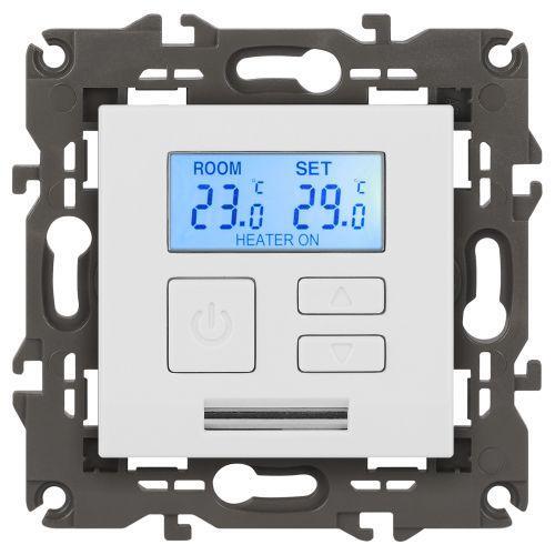 Терморегулятор теплый пол / отопление электронный серии Эра Elegance цвет белый 14-4111-01. Рамки приобретаются отдельно. Рамки Эра Elegance ПЛАСТИК: 1 пост 14-5001-хх, 2 поста 14-5002-хх, 3 поста 14-5003-хх, 4 поста 14-5004-хх, 5 постов 14-5005-хх; СТЕКЛО: 1 пост 14-5101-хх, 2 поста 14-5102-хх, 3 поста 14-5103-хх, 4 поста 14-5104-хх; МЕТАЛЛ: 1 пост 14-5201-хх, 2 поста 14-5202-хх, 3 поста 14-5203-хх, 4 поста 14-5204-хх; ДЕРЕВО: 1 пост 14-5301-хх, 2 поста 14-5302-хх, 3 поста 14-5303-хх, 4 поста 14-5304-хх (хх - код цвета: 00-прозрачный, 01-белый, белёный дуб, 02-слоновая кость, 03-алюминий, 04-шампань, 05-чёрный, чёрное дерево, 07-ясень, 09-дуб, 10-венге, 11-клён, 14-медь, 21-жёлтый, 22-оранжевый, 23-красный, 25-бордо, 26-лайм, 27-зелёный, 28-голубой, 29-синий, 30-розовый, 31-мокко, 32-серый, 41-сталь, 42-титан).
