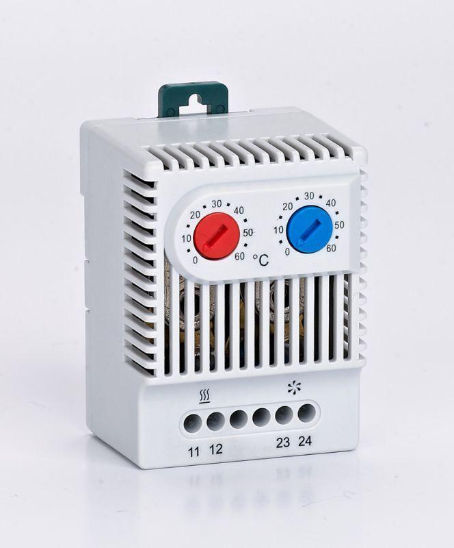 Комбинированный термостат с нормальной открытым и нормально закрытым контактами Dekraft.Диапазон уставок - от 0 до +60°C. Напряжение питающей сети - до 250 В АС. Предназначено для применения совместно с резистивными нагревателями и/или фильтрующими для обогрева и/или охлаждения внутреннего пространства электротехнических шкафов