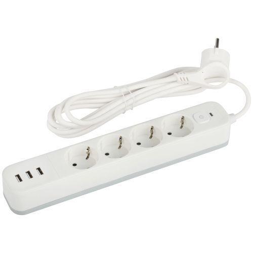 Сетевой фильтр ЭРА USF-4es-3m-3xUSBA-W с заземлением, с выключателем, 4 розетки, 3USB, провод 3м, ПВС 3x0,75мм2. Базовый уровень защиты техники: от импульсных помех, от перегрузки, от короткого замыкания. Максимальная мощность 10А/2200 Вт. Корпус из негорючего пластика (полипропилен). Вилка обеспечена кольцом для удобного извлечения ее из розетки. Выключатель со световой индикацией позволяет выключить все приборы, подключенные к сетевому фильтру, не вынимая вилки из розетки. Отлично подойдет для защиты бытовой и компьютерной техники. Сетевой фильтр оснащен 3USB для зарядки мобильных устройств.