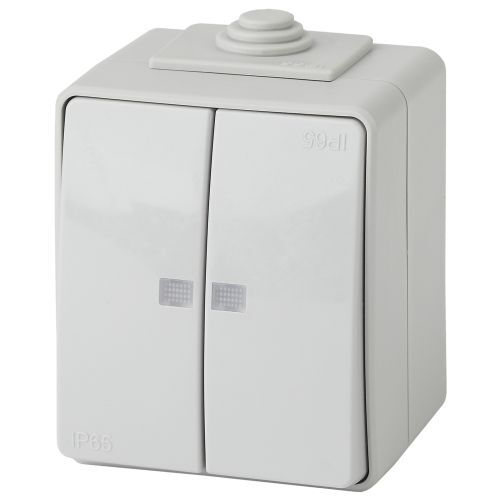 Выключатель влагозащищённый 2-клавишный с подсветкой серии Эра Эксперт накладн IP65 цвет серый 11-1605-03. Номинальные характеристики 10А 250В. Выполнен из качественного поликарбоната, оснащён уникальными винтовыми клеммами ЭКСПЕРТ для максимально качественного зажима кабеля в механизме.