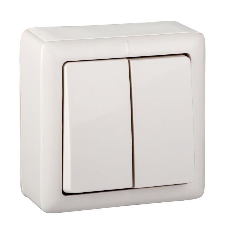 Выключатель двухклавишный Systeme Electric (ранее Schneider Electric) РОНДО (открытой установки, цвет белый) с изолирующей пластиковой пластиной предназначен для сетей до 250 В, на ток до 6 А. Выключатель изготовлен из ABS-пластика, прост в установке, прочен и надежен в применении. Двухклавишный выключатель позволяет управлять двумя источниками света с одной точки. Сделано в России.