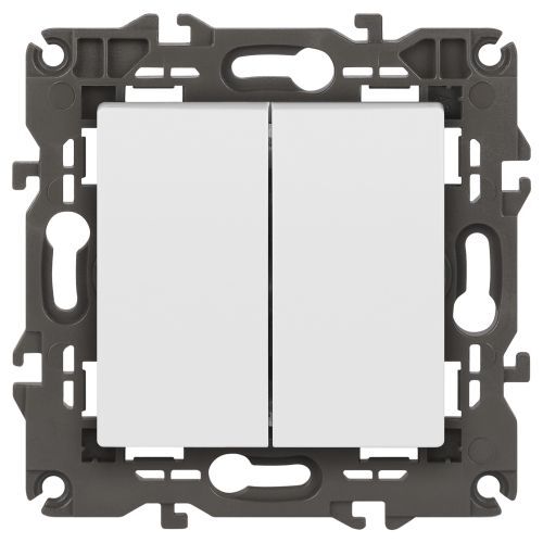 Выключатель 2-клавишный Эра Elegance белый 14-1104-01. Оснащён автоматическими клеммами для надёжной фиксации жил кабеля в механизме. Рамки приобретаются отдельно. Рамки Эра Elegance ПЛАСТИК: 1 пост 14-5001-хх, 2 поста 14-5002-хх, 3 поста 14-5003-хх, 4 поста 14-5004-хх, 5 постов 14-5005-хх; СТЕКЛО: 1 пост 14-5101-хх, 2 поста 14-5102-хх, 3 поста 14-5103-хх, 4 поста 14-5104-хх; МЕТАЛЛ: 1 пост 14-5201-хх, 2 поста 14-5202-хх, 3 поста 14-5203-хх, 4 поста 14-5204-хх; ДЕРЕВО: 1 пост 14-5301-хх, 2 поста 14-5302-хх, 3 поста 14-5303-хх, 4 поста 14-5304-хх (хх - код цвета: 00-прозрачный, 01-белый, белёный дуб, 02-слоновая кость, 03-алюминий, 04-шампань, 05-чёрный, чёрное дерево, 07-ясень, 09-дуб, 10-венге, 11-клён, 14-медь, 21-жёлтый, 22-оранжевый, 23-красный, 25-бордо, 26-лайм, 27-зелёный, 28-голубой, 29-синий, 30-розовый, 31-мокко, 32-серый, 41-сталь, 42-титан).