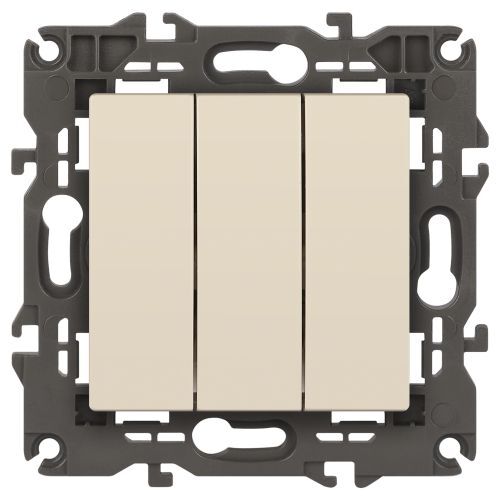 Выключатель 3-клавишный Эра Elegance слоновая кость 14-1107-02. Рамки приобретаются отдельно. Рамки Эра Elegance ПЛАСТИК: 1 пост 14-5001-хх, 2 поста 14-5002-хх, 3 поста 14-5003-хх, 4 поста 14-5004-хх, 5 постов 14-5005-хх; СТЕКЛО: 1 пост 14-5101-хх, 2 поста 14-5102-хх, 3 поста 14-5103-хх, 4 поста 14-5104-хх; МЕТАЛЛ: 1 пост 14-5201-хх, 2 поста 14-5202-хх, 3 поста 14-5203-хх, 4 поста 14-5204-хх; ДЕРЕВО: 1 пост 14-5301-хх, 2 поста 14-5302-хх, 3 поста 14-5303-хх, 4 поста 14-5304-хх (хх - код цвета: 00-прозрачный, 01-белый, белёный дуб, 02-слоновая кость, 03-алюминий, 04-шампань, 05-чёрный, чёрное дерево, 07-ясень, 09-дуб, 10-венге, 11-клён, 14-медь, 21-жёлтый, 22-оранжевый, 23-красный, 25-бордо, 26-лайм, 27-зелёный, 28-голубой, 29-синий, 30-розовый, 31-мокко, 32-серый, 41-сталь, 42-титан).