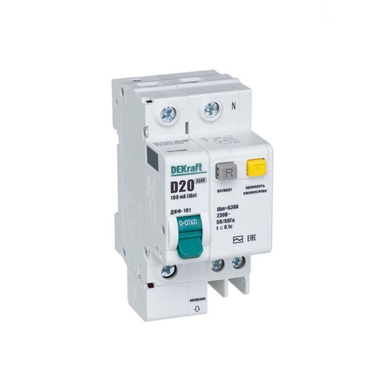 Выключатель автоматический дифференциального тока 2п (1P+N) D 20А 100мА тип AC ДИФ-101 со встроен. защит. от сверхтоков DEKraft 15212DEK