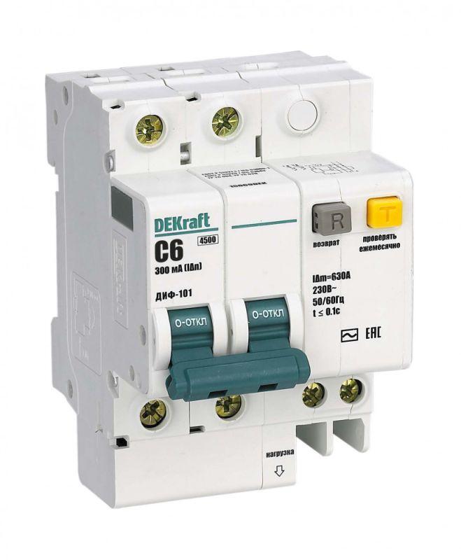 Выключатель автоматический дифференциального тока 2п C 6А 300мА тип AC ДИФ-101 со встроен. защитой от сверхтоков DEKraft 15069DEK
