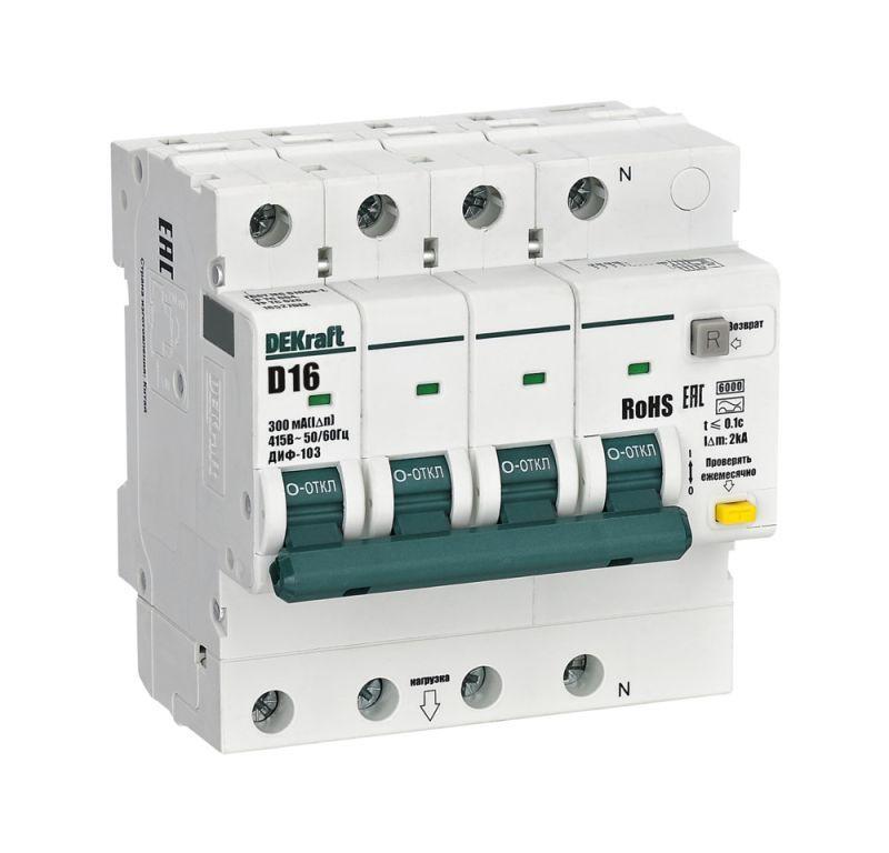 Автоматические выключатели дифференциального тока серии ДИФ-103 6кА NEW Dekraft; 3P+N; номинальный ток 16 А; ном. диф. ток 300 мА; тип диф. расцепителя - AC; кривая отключения - D; Icn, Ics = 6 кА; тип устройства - электронный; монтаж – на DIN-рейку. АВДТ обеспечивают три вида защиты — от короткого замыкания, перегрузки и возникновения утечки тока (в частности, вследствие прикосновения человека к токоведущим частям). АВДТ с отключающей способностью 6кА применяются во вводно-распределительных устройствах (ВРУ), главных распределительных щитах (ГРЩ), осветительных и распределительных установках в общественных, административных, производственных, промышленных и других подобных зданиях.