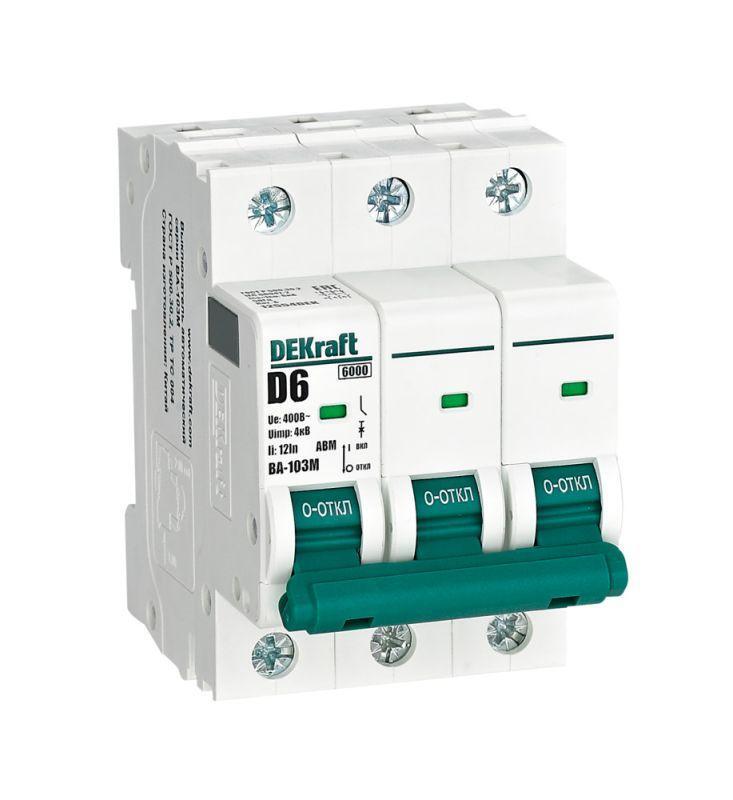 Автоматический выключатель без теплозащиты серии ВА-103M Dekraft; 3P; ном. ток 6 А; ном. раб. напряжение 400 В; кривая отключения D. Автоматические выключатели серии ВА-103М имеют специальное назначение для систем противопожарной защиты и вентиляции и выдерживают ток КЗ до 6000 А. Также они могут использоваться для нечастых оперативных включений и отключений указанных цепей. Автоматические выключатели соответствуют директиве RoHS, имеют расширенный диапазон рабочих температур от -25 до +60 °C, удобны и безопасны в эксплуатации.