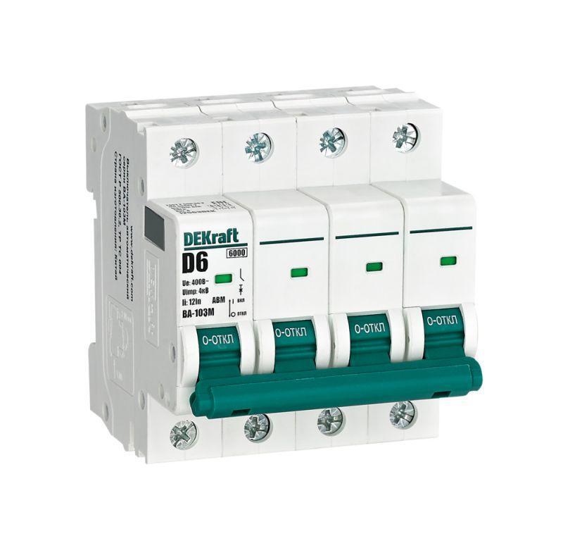 Автоматический выключатель без теплозащиты серии ВА-103M Dekraft; 4P; ном. ток 6 А; ном. раб. напряжение 400 В; кривая отключения D. Автоматические выключатели серии ВА-103М имеют специальное назначение для систем противопожарной защиты и вентиляции и выдерживают ток КЗ до 6000 А. Также они могут использоваться для нечастых оперативных включений и отключений указанных цепей. Автоматические выключатели соответствуют директиве RoHS, имеют расширенный диапазон рабочих температур от -25 до +60 °C, удобны и безопасны в эксплуатации.