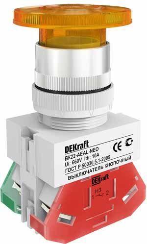Выключатель кнопочный серии ВК-22 Dekraft; с грибовидным толкателем; желтый; с неоновой лампой; ном.ток 10 А; установка - на панели или двери; степень защиты - IP54; подключение - винтовыми зажимами. Выключатели кнопочные ВК-22 предназначены для коммутации электрических цепей и индикации состояния электрических цепей. Применяются в сетях переменного тока частотой 50/60 Гц с напряжением до 660В. Могут устанавливаться на подвижных и неподвижных частях стационарных установок.