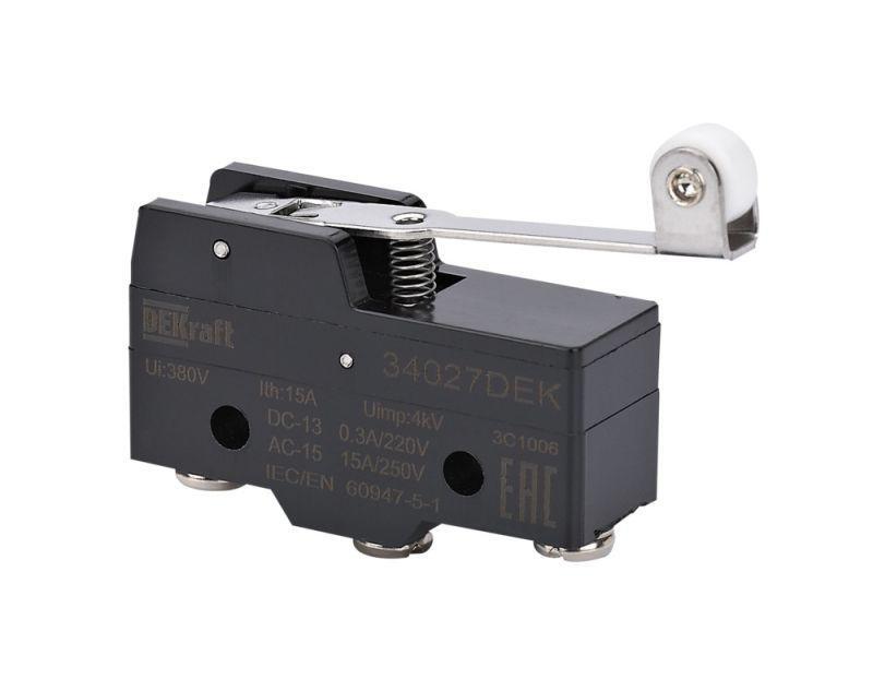 Выключатель концевой 1НО1НЗ миниатюрный шарнирн. длиннорычажного типа с роликом DEKraft 34027DEK